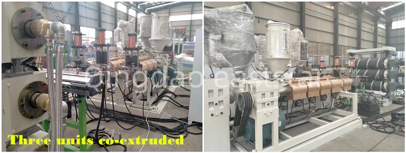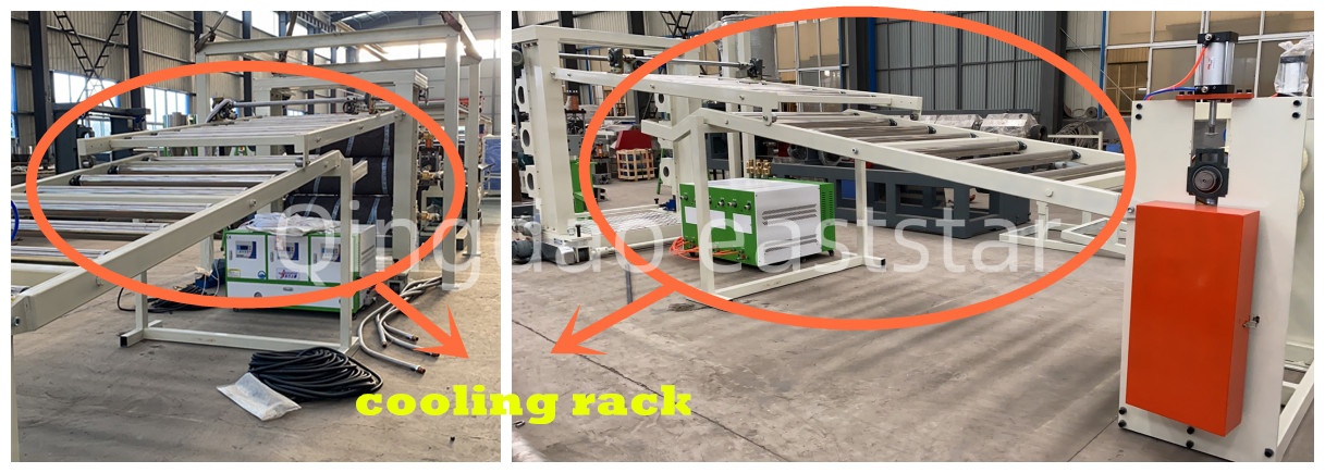 Opremili smoLinija za proizvodnjo večslojnih plošč za koekstruzijo ABSs popolnim napajalnim in pomožnim sistemom. Ekstruder SJ-130 je opremljen z vijačnim podajalnikom iz nerjavečega jekla E-1000, ekstruder SJ-70 pa z vakuumskim podajalnikom E-300, ki zagotavlja natančno dobavo različnih surovin. Hladilni nosilec je opremljen z 8 metrov dolgimi valji iz nerjavečega jekla in tremi nastavljivimi rezili robov, ki zagotavljajo zadostno hlajenje pločevine in čiste robove. Rezalni stroj uporablja mehanske električne škarje, opremljene s korejskim kodirnikom Autonics, za doseganje samodejnega rezanja na fiksno dolžino.