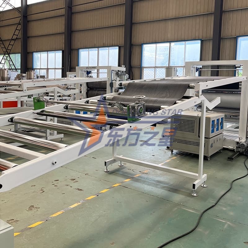 TheLinija za proizvodnjo protizdrsnih plošč TPEuporablja MJ-1160 obešalnik z zrcalnim končnim pretočnim kanalom in kalander s tremi valji SG-1200 za natančno delovanje. Pretočni kanal kalupa je kromiran in poliran, da se zagotovi enakomerna porazdelitev taline. Koledar uporablja zrcalne valje φ400 mm s površinsko hrapavostjo Ra≤0,025 μm. Preko neodvisnega sistema za nadzor temperature natančno uravnava temperaturo valja.