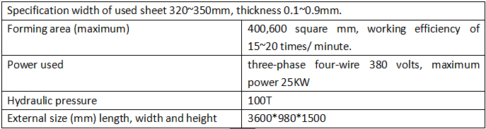 Tehnični parameter stroja za sejanje pladnjev za vrtce Specifikacija širine uporabljenega lista: 300 ~ 320 mm, debelina: 0,8 ~ 2 mm. Območje oblikovanja (največ): 400 * 600 mm, delovna učinkovitost 15 ~ 20-krat / minuto. Porabljena moč: trifazni štirižilni 380 voltov, največja moč 25KW Hidravlični tlak: 100T Zunanja velikost (mm) dolžina, širina in višina) 3600 mm * 980 mm * 1500 mm