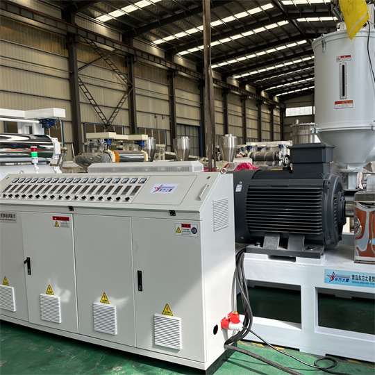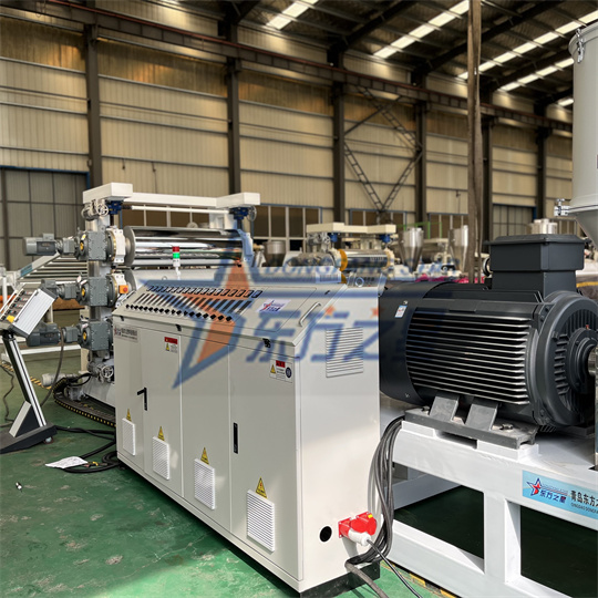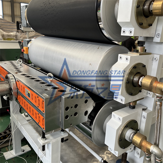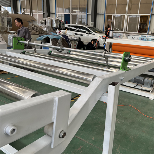Oprema za PVC antistatične plošče: Oprema je v glavnem sestavljena iz ekstruderja s 120 enojnimi vijaki, kalandra s tremi valji, nosilca za hlajenje, vlečnega stroja z gumijastimi valji, stroja za striženje in