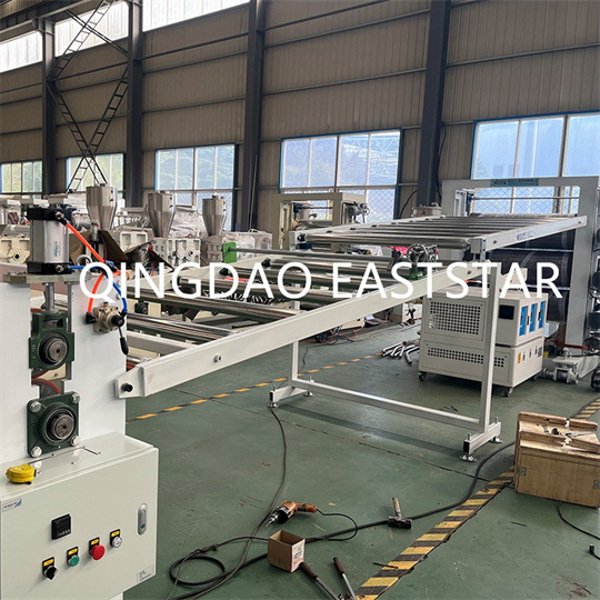 Oprema za plošče s PVC nadstreški je v glavnem sestavljena iz ekstruderja z dvema polžema, kalupa za plošče, kalandra s tremi valji, hladilnega nosilca, vlečnega stroja z gumijastimi valji, stroja za rezanje in transportne naprave.
