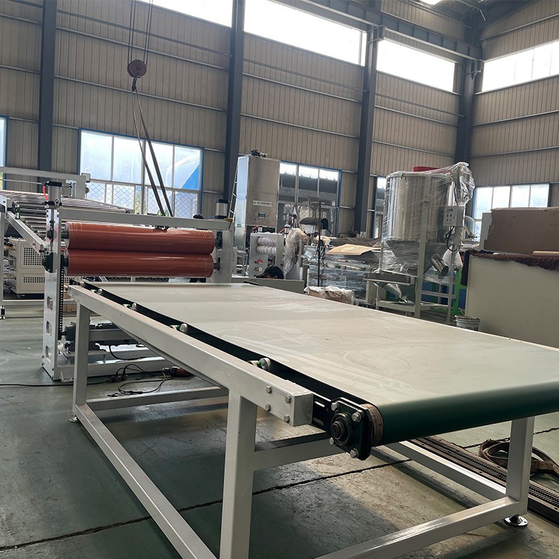 Proizvodna linija ekstruderja za prozorne pločevine iz PVC: Oprema je v glavnem sestavljena iz ekstruderja z dvema polžema, ploščatega kalupa, kalandra s tremi valji, hladilnega nosilca, vlečnega stroja z gumijastimi valji, rezalnika