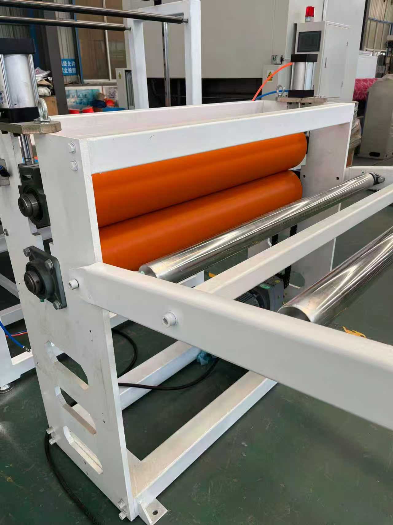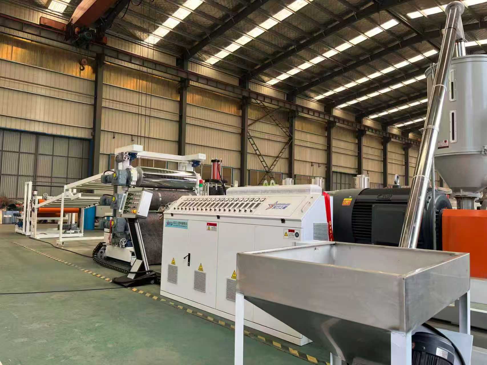 TPE-1000mm oprema za protizdrsne podloge avtomobilske talne preproge: Oprema je v glavnem sestavljena iz ekstruderja z enim polžem, trivaljnega kalandra, 6-metrskega hladilnega nosilca, vlečnega stroja z gumijastimi valji, stroja za striženje in naprave za tekoči trak.